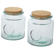 Juego de dos recipientes de vidrio reciclado de 1500 ml para alimentos secos, con tapa de corcho. Fabricado a partir de 3 botellas de vidrio. El vidrio reciclado utiliza menos energía, materia prima y aditivos para su fabricación de lo que es habitual en la fabricación de vidrio tradicional. Tamaño del recipiente: 15 cm de altura y 14 cm de diámetro. 17 x Ø 30 cm